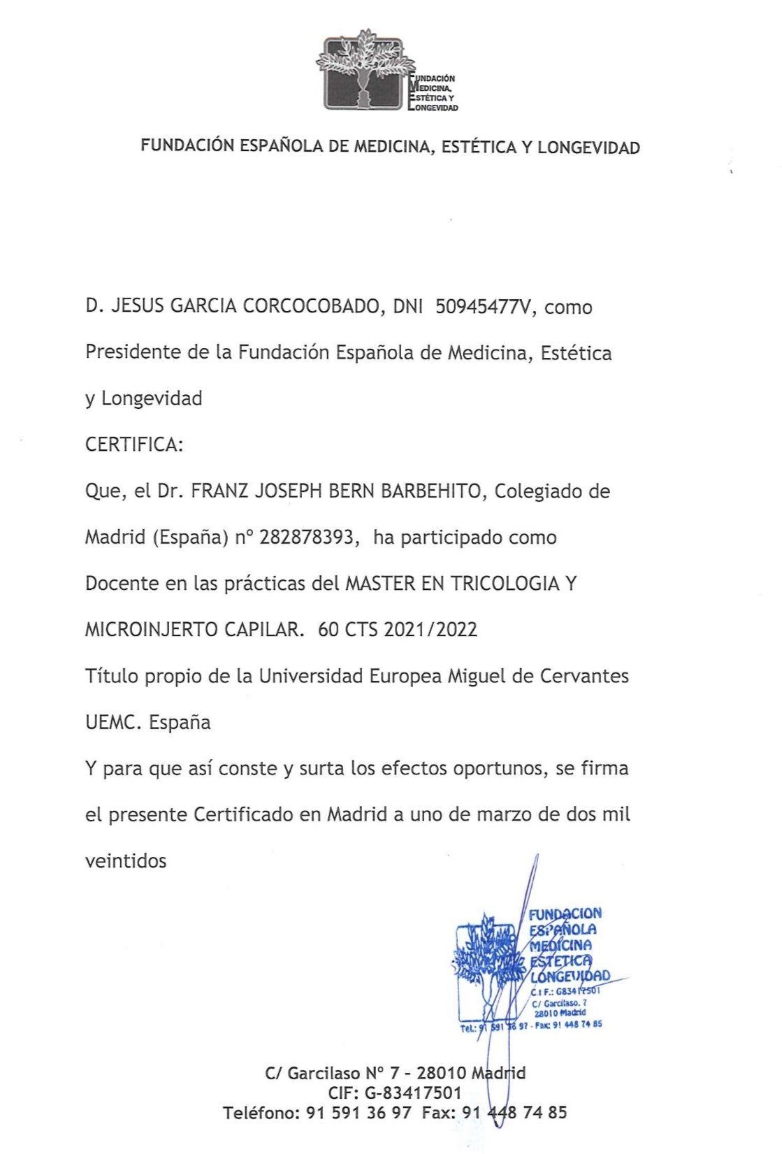 Médico cirujano y Magíster en tricología y microinjerto capilar, el Dr. Franz Joseph Bern Barbehito es miembro de la Organización Europea de cirujanos capilares WFI